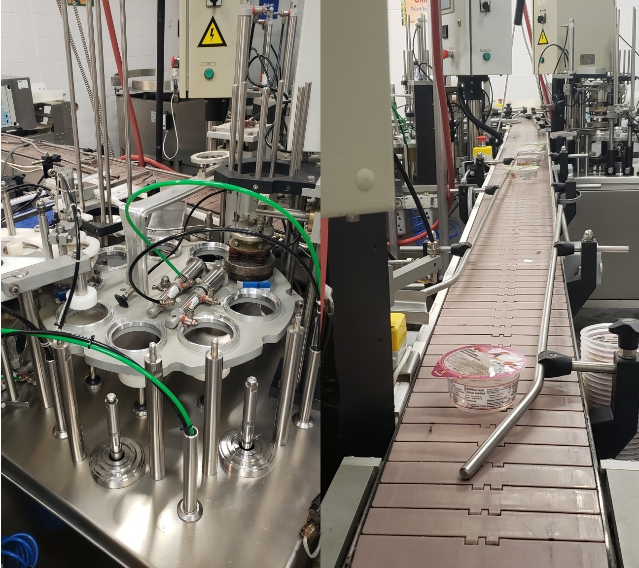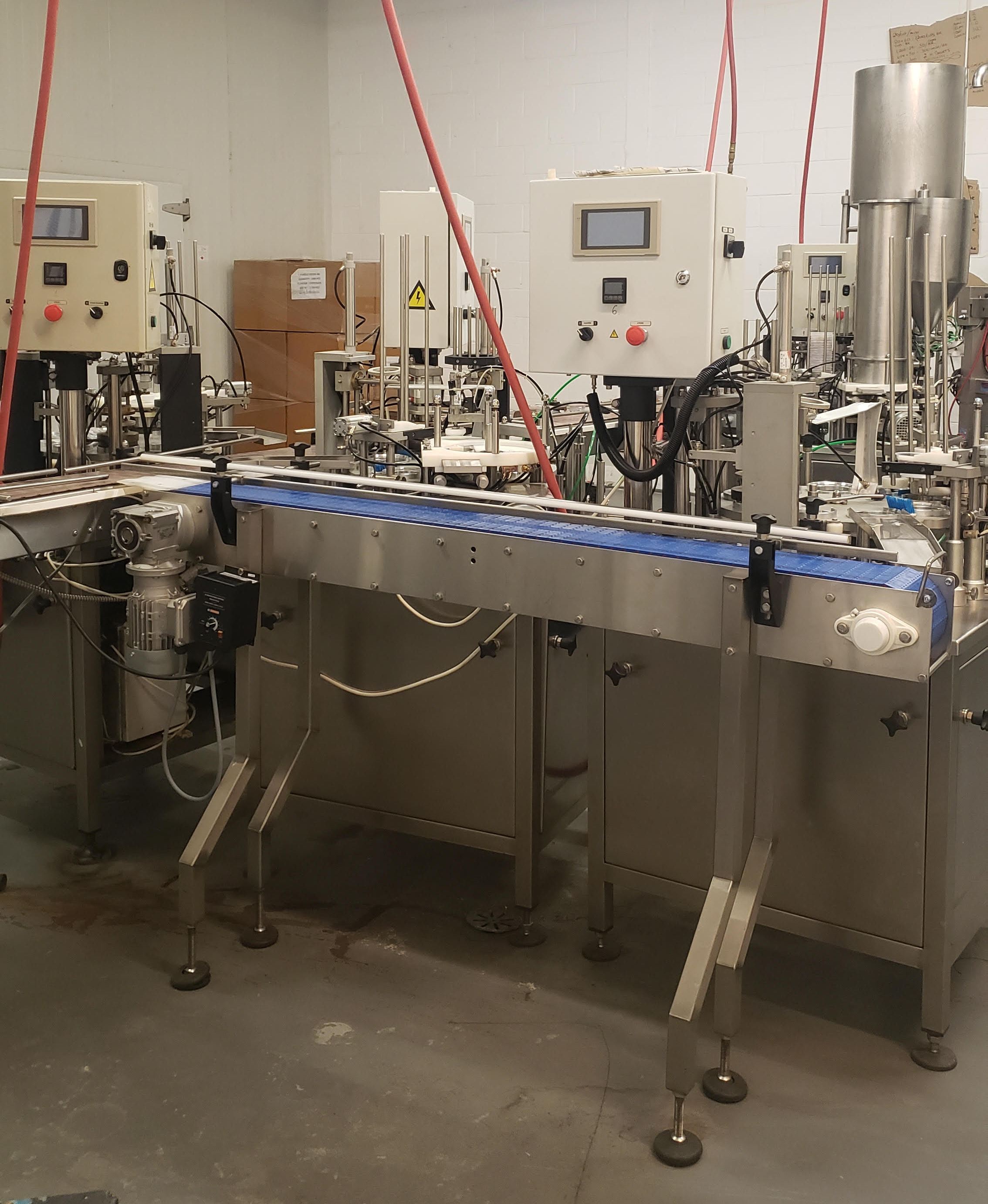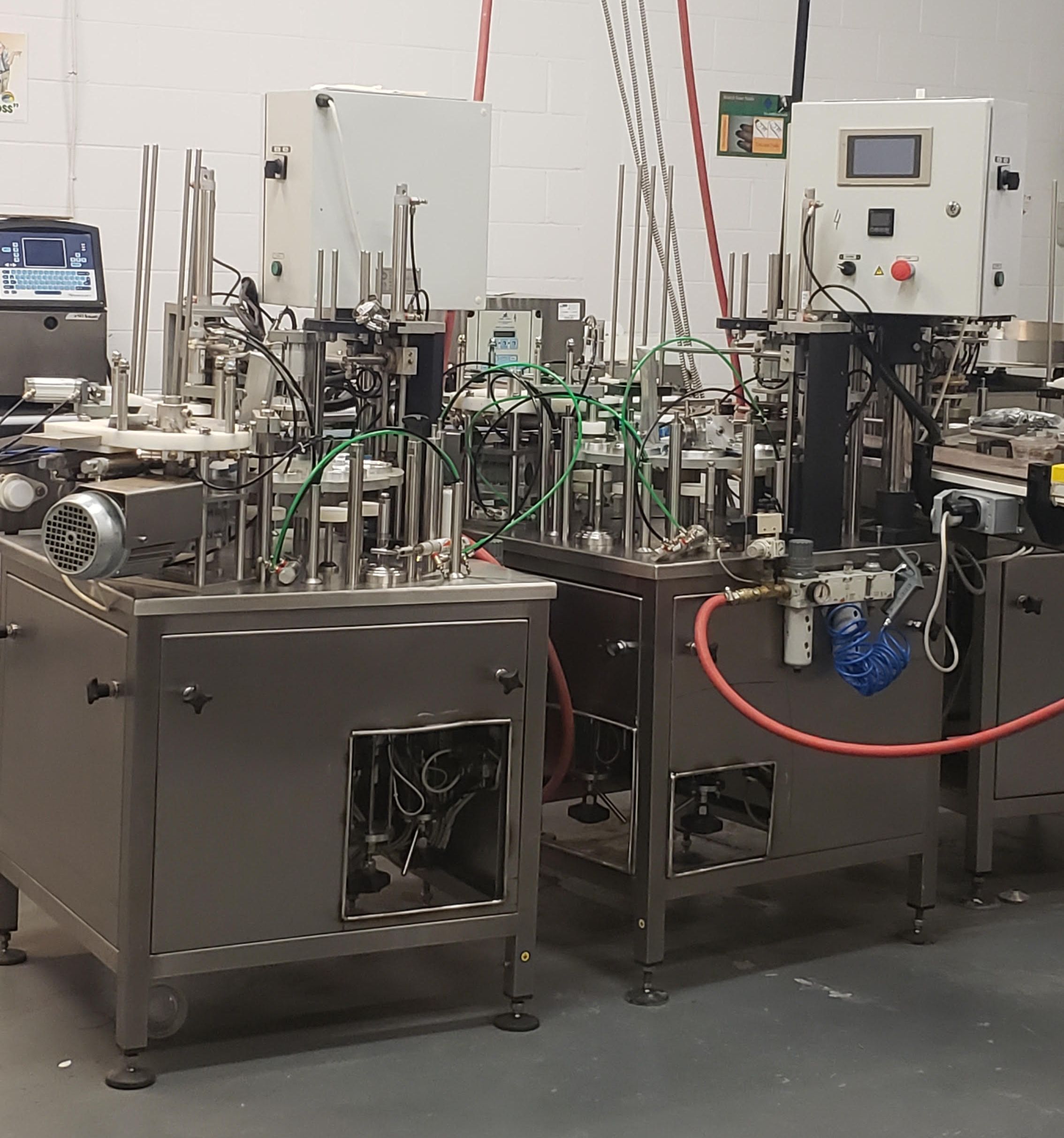 Qty 2. Used 9 Rotary Cup Filling Sealing Machines with Stainless Steel Hoppers with Conveyor